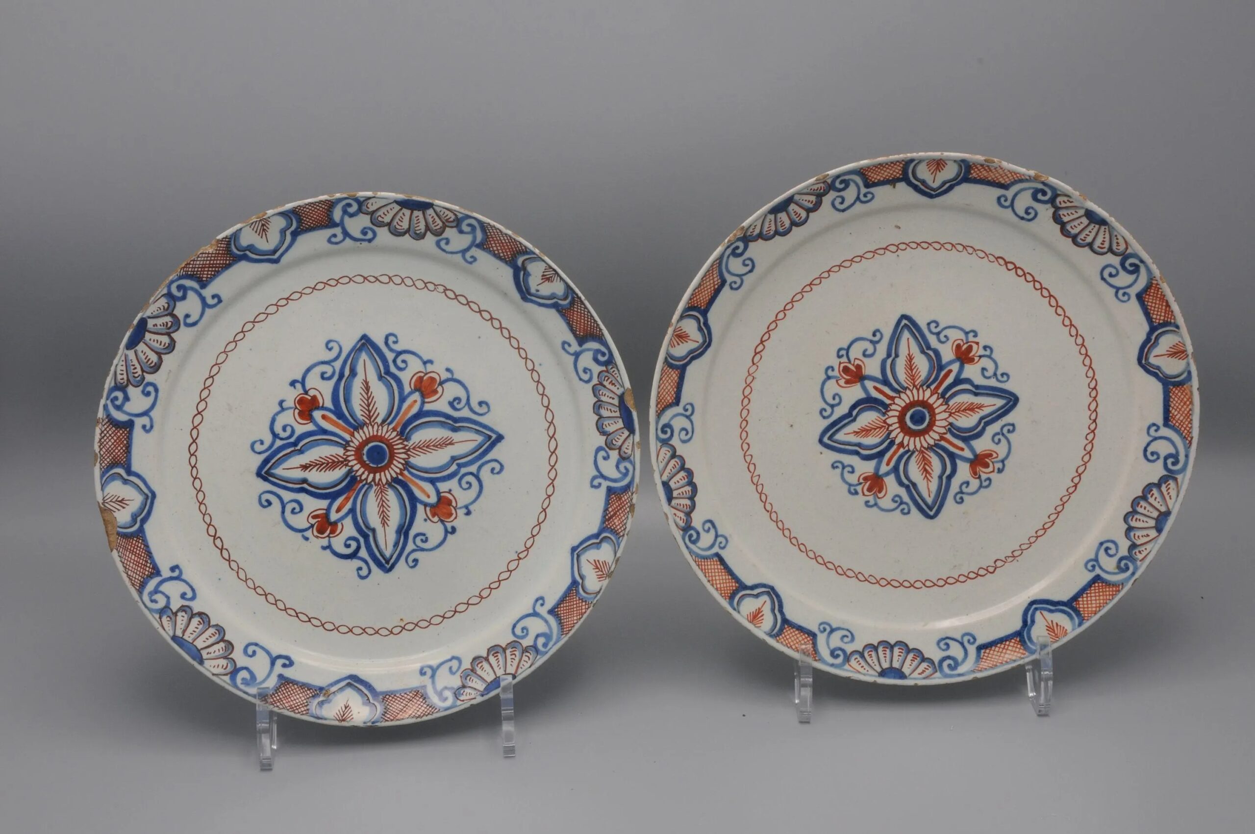 Excellent pair of mid-18th-century Delftware plates featuring a rare geometric decoration of leaves and scrolls, painted in cobalt blue and iron-red. The borders display foliage scrolls, flowers, and shell motifs.