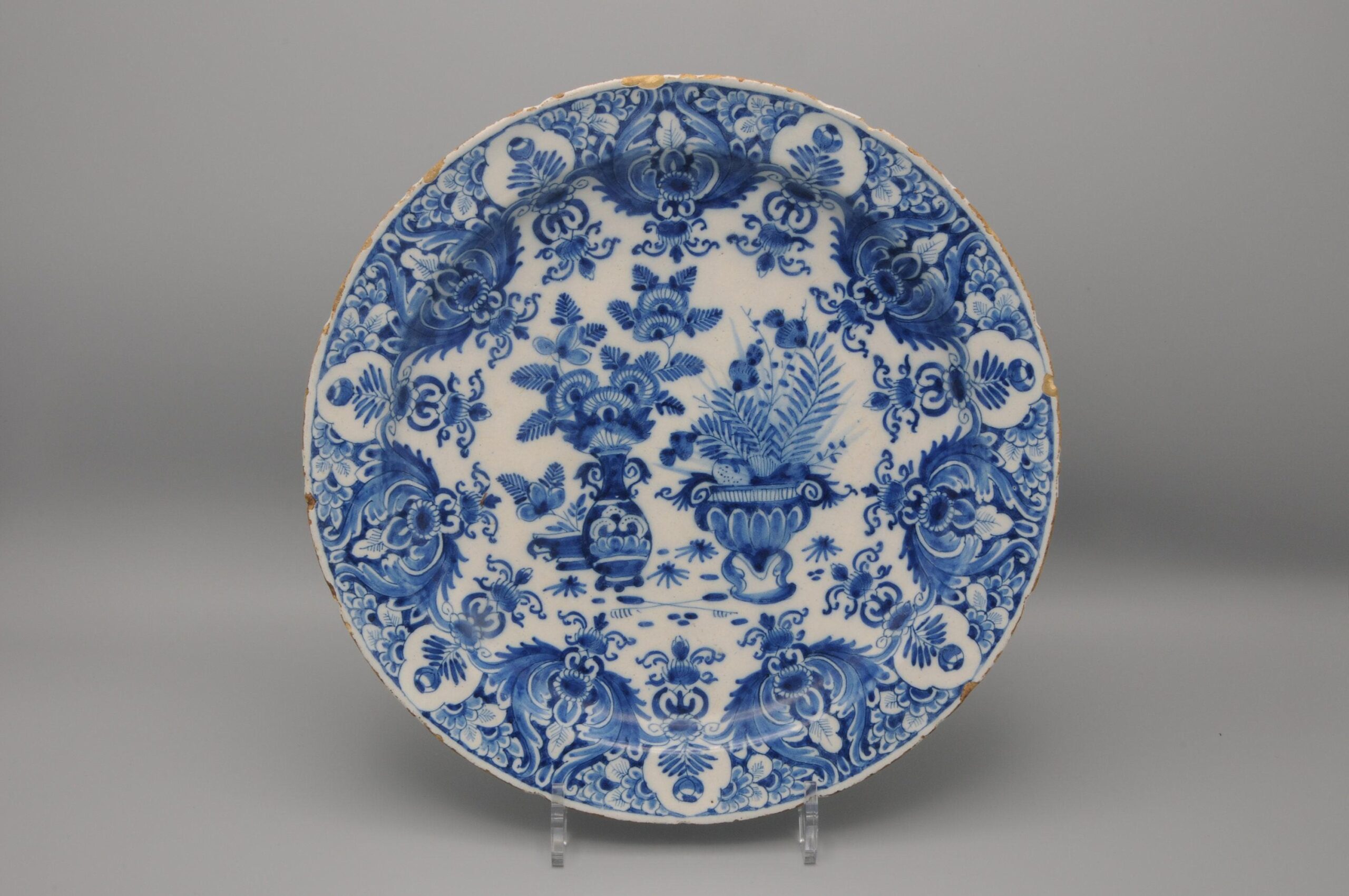 Rare early 18th century Blue Delftware plate with chinoiserie decoration of a flower baskets. Beautiful border decoration of rich foliage, flowers and scrollwork.